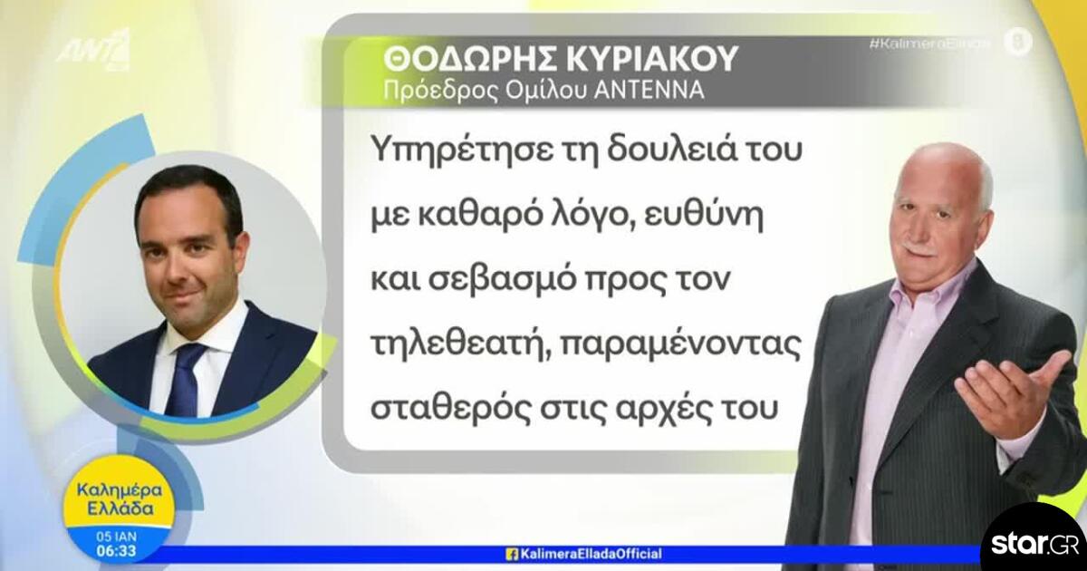 Ο Πρόεδρος του Ομίλου Antenna, Θοδωρής Κυριακού, και όλοι οι εργαζόμενοι του ΑΝΤ1 αποχαιρετούμε με σεβασμό και ευγνωμοσύνη έναν άνθρωπο που ταύτισε τη διαδρομή του με τη διαδρομή του σταθμού και άφησε ανεξίτηλο το αποτύπωμά του στην ελληνική δημοσιογραφία. Η σκέψη όλων μας αυτές τις δύσκολες ώρες βρίσκεται στην οικογένεια και τους οικείους του, στους οποίους εκφράζουμε τα ειλικρινή και βαθιά μας συλλυπητήρια.