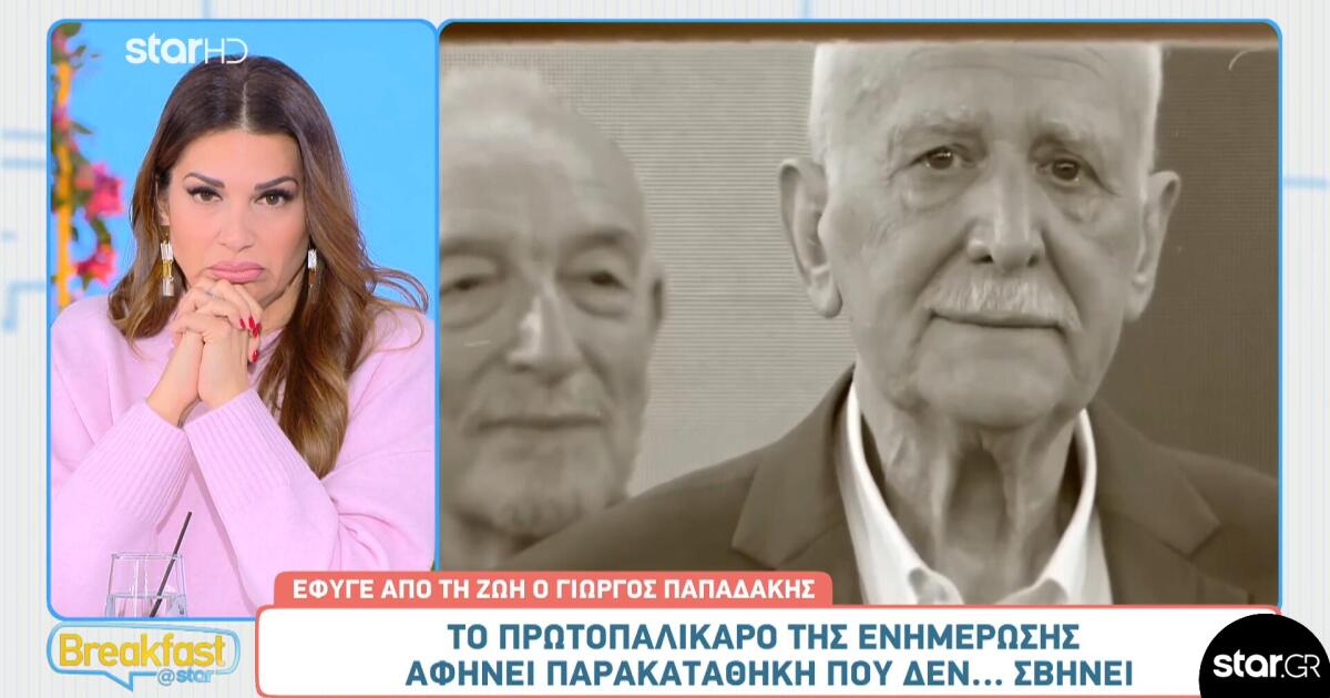 Όλη η τηλεόραση σήμερα αποχαιρετά ζωντανά τον Γιώργο Παπαδάκη, ύστερα από τον ξαφνικό θάνατό του, χθες Κυριακή 4 Ιανουαρίου, σε ηλικία 74 χρόνων.