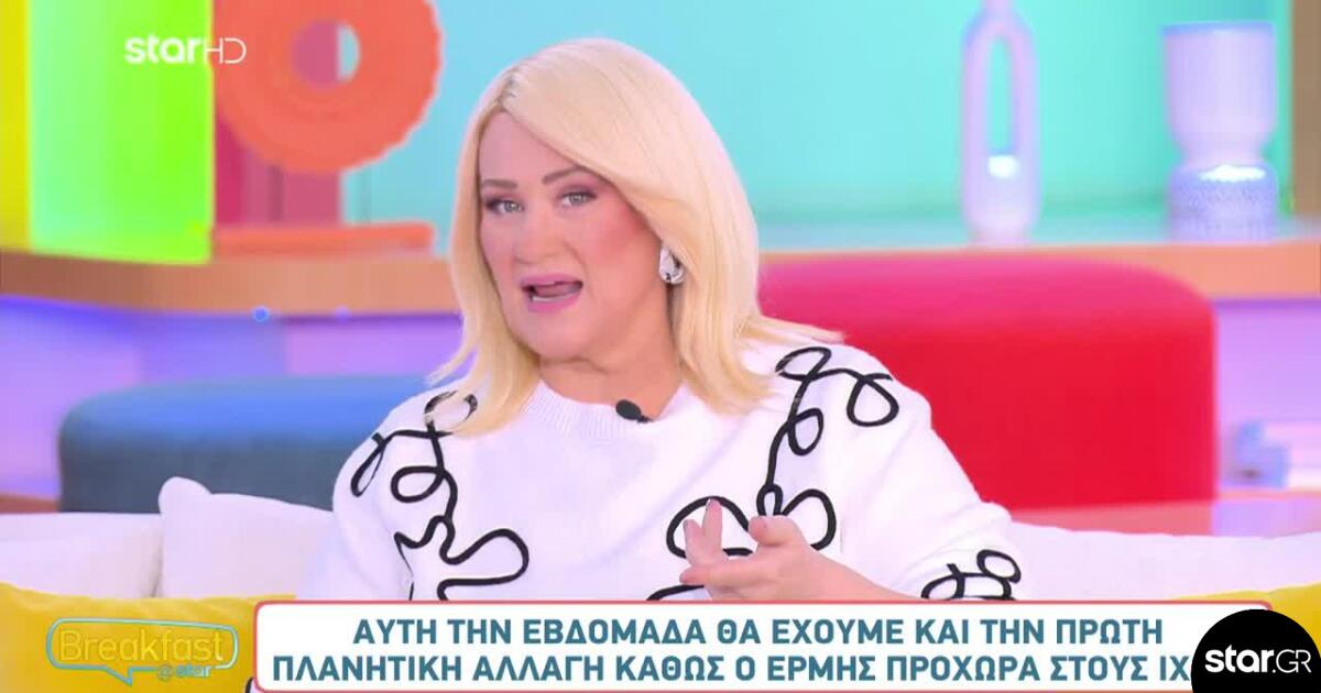 «Ο Ουρανός λοιπόν, ο πλανήτης των αλλαγών, των απρόοπτων, των απρόσμενων εξελίξεων αλλά και της απελευθέρωσης, της επαναστατικής διάθεσης, όλα αυτά. Γυρίζει σε ορθή πορεία αυτή την εβδομάδα, θα σχηματίσει και όψεις με Ερμή και Αφροδίτη και πάει πολύ γρήγορα για να αλλάξει ζώδιο τον Απρίλιο», κατέληξε η Άση Μπήλιου στην πρωινή εκπομπή του Star.