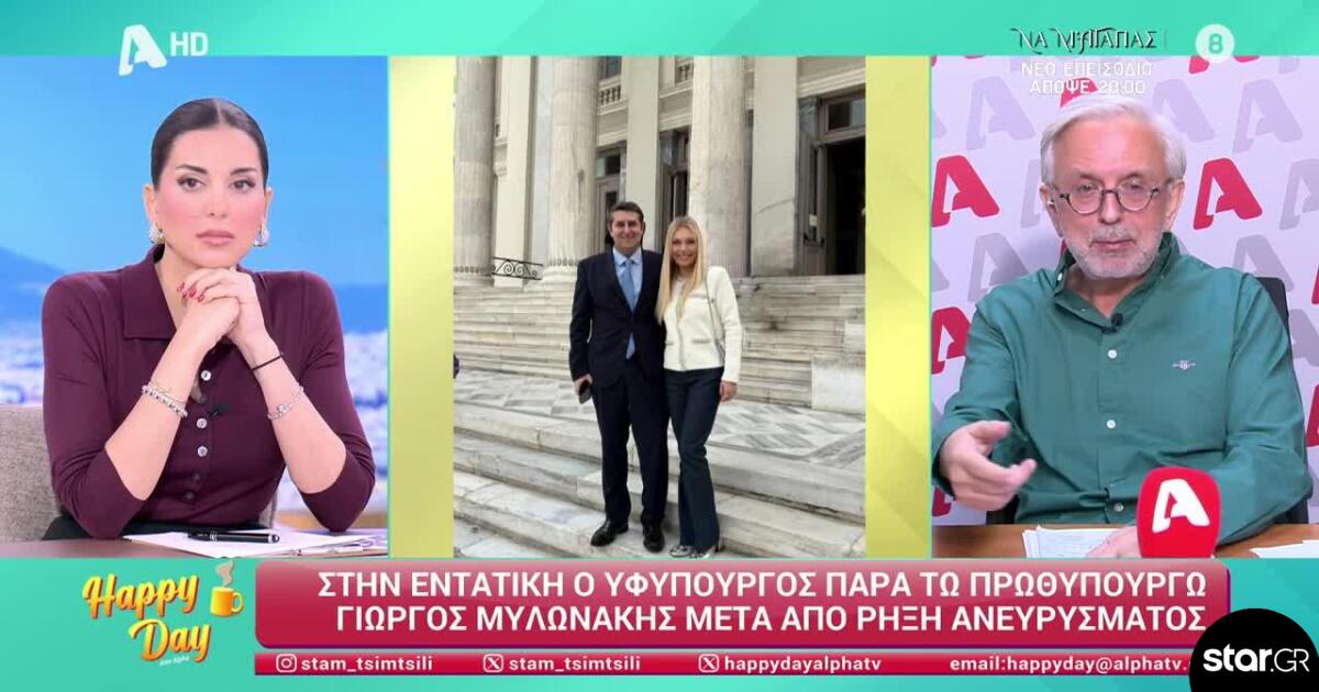 To μήνυμα που έστειλε η Τίνα Μεσσαροπούλου στον σύζυγό της Γιώργο Μυλωνάκη λίγες ώρες πριν ο Υφυπουργός παρά τω Πρωθυπουργώ της Ελλάδας λιποθυμήσει κατά τη διάρκεια του πρωϊνού καφέ στο Μαξίμου και μεταφερθεί εσπευσμένα στη ΜΕΘ του Ευαγγελισμού, αποκάλυψε ο Δήμος Βερύκιος στην εκπομπή «Happy Day».