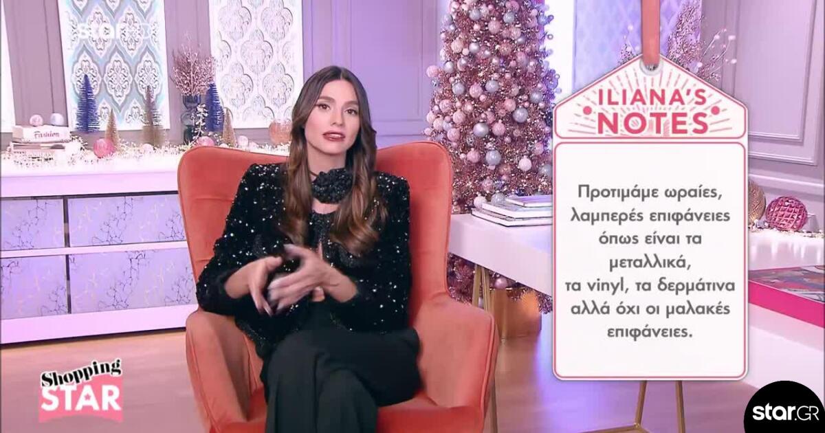 Η Ηλιάνα Παπαγεωργίου συμβουλεύει τις τηλεθεάτριες του Shopping Star να προτιμήσουν ωραίες, λαμπερές και μεταλλικές επιφάνειες. Όπως είναι τα vinyl, τα μεταλλικά, τα δερμάτινα αλλά όχι το σατέν και τα ανοιχτόχρωμα κρύσταλλα.