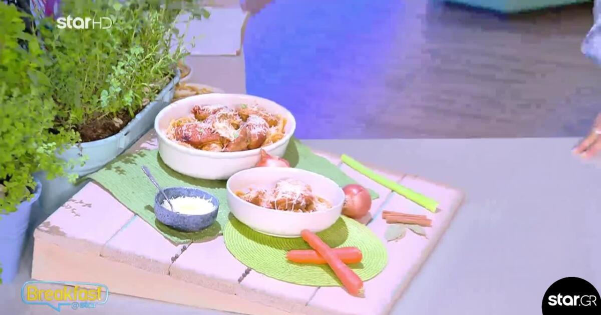 O σεφ ετοίμασε κόκορα κρασάτο με χοντρά μακαρόνια και έδειξε βήμα-βήμα στους τηλεθεατές τη διαδικασία.