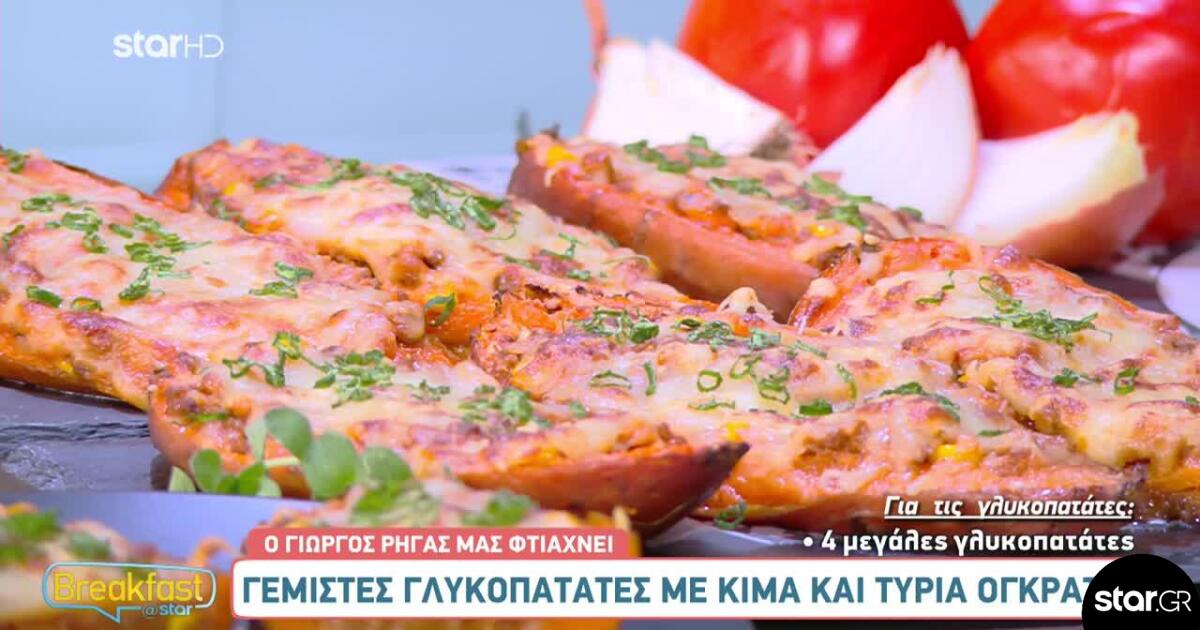 Ο Γιώργος Ρήγας μπήκε λοιπόν το πρωί στην κουζίνα της εκπομπής Breakfast@Star και ετοίμασε λαχταριστές γλυκοπατάτες γεμιστές με κιμά και τυριά ογκρατέν.